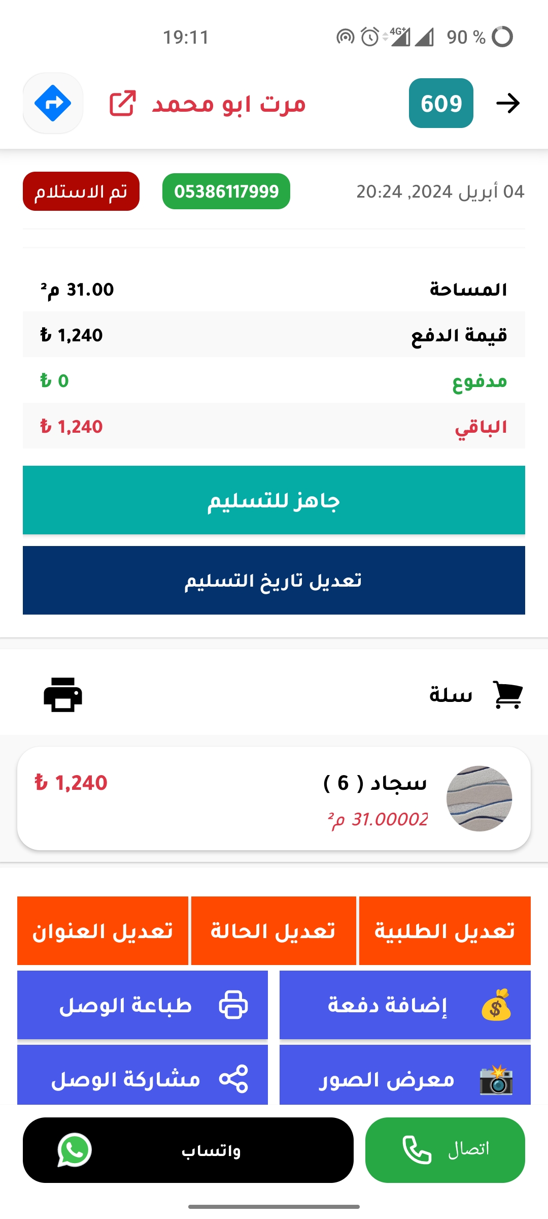 إدراج الصورة السجاد في الطلبية: يضمن إدراج الصورة لكل طلبية حل مشكلة فقدان السجاد ويسهل متابعة عملية التنظيف بشكل دقيق.